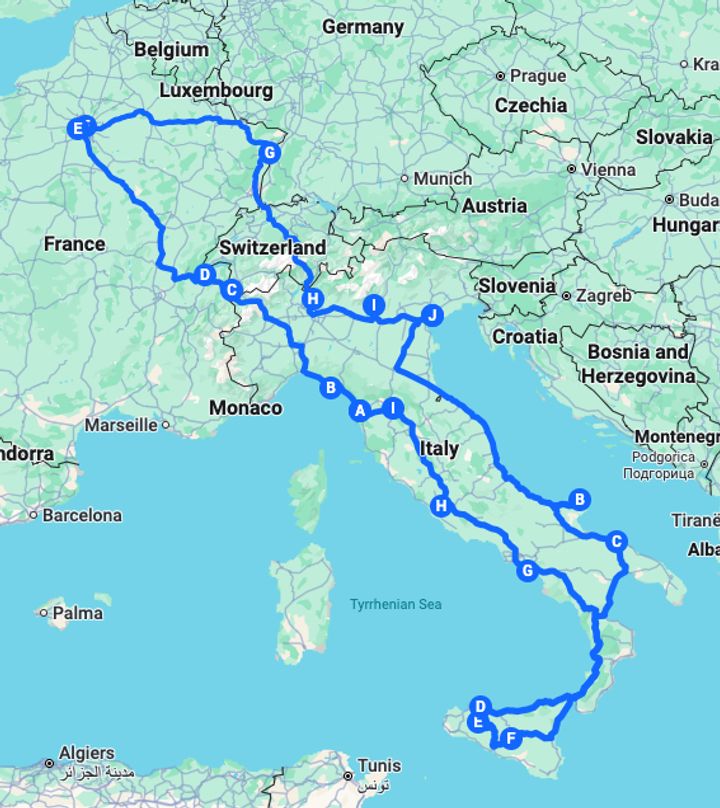 Somewhere on the Adriatic coast, just south of Peschici in the first week, we'd driven past Lovers Arch (Arco degli Innamorati) in the white cliffs above the most improbable blue water I'd ever seen, and I'd spent the rest of the trip quietly searching for something that matched it. A perfect cove. Somewhere between the movie sets of The Talented Mr Ripley and The Count of Monte Cristo in my head. I never found it. We drove around Sicily looking. We drove up the west coast looking. We covered five and a half thousand kilometres of Mediterranean coastline. Lovers Arch near Peschici, it turned out, was probably as good as it was going to get. First week. Day five.